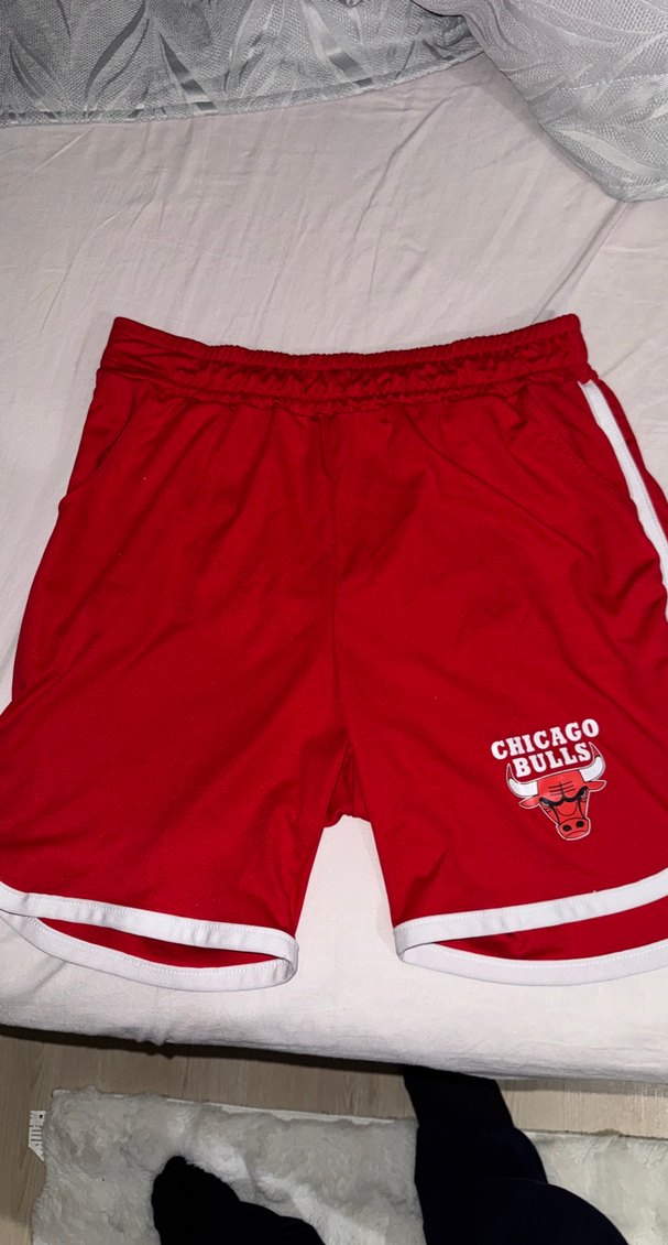 Renkli Chicago Bulls baskılı, yumuşak ve sıcak kumaştan yapılmış, sportif ve trend günlük kullanım için uygun kırmızı mini şort.