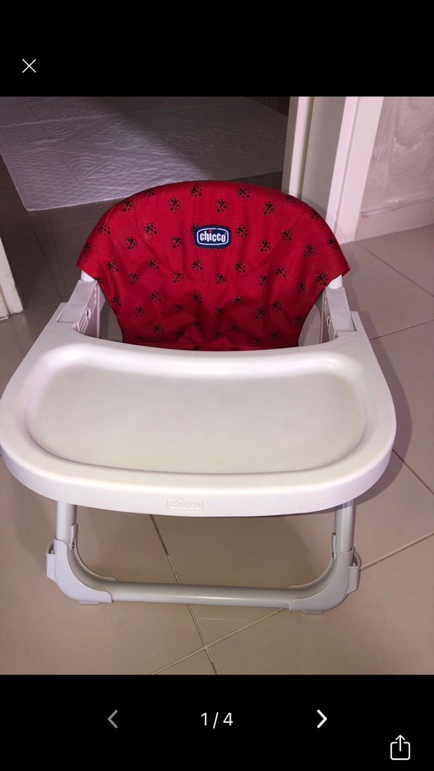 Chicco marka, kırmızı kumaşlı ve gri tepsili bebek mama sandalyesi, rahat ve güvenli oturma alanı sunar. ️