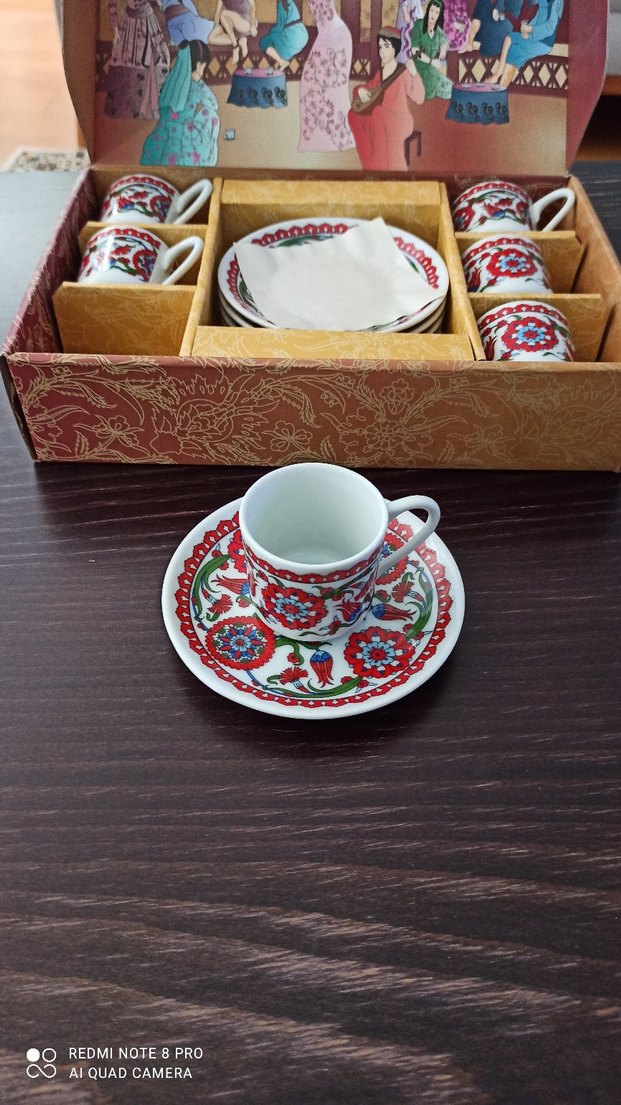 Kırmızı çiçek desenli renkli 6 fincan ve tabak seti, şık kutusunda sunulmuştur. ☕
