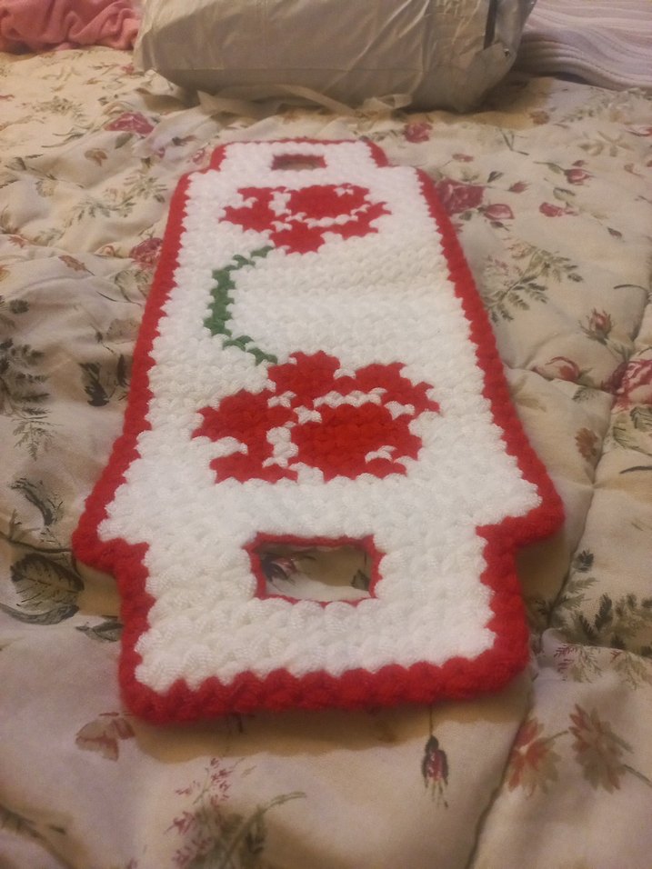 Kırmızı çiçek desenli, beyaz zeminli ve kırmızı kenarlıklı yumuşak dokulu banyo süngeri.