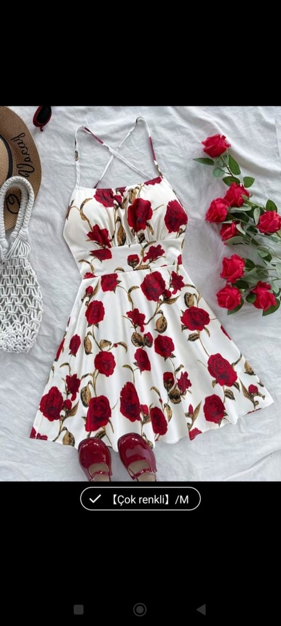 Beyaz sentetik kumaştan, kırmızı çiçek desenli, askılı ve mini kesim, vintage bohem tarzda, volan detaylı elbise.