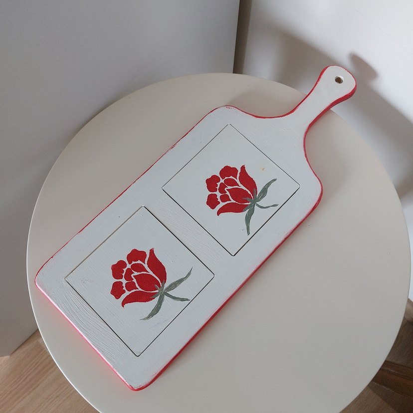Saplı beyaz sunum tahtası. üzerinde kırmızı çiçek desenli iki adet çıkabilir bardak altlığı bulunur.