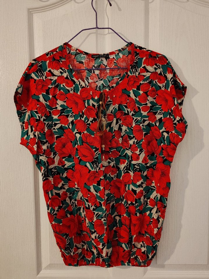 Kısa kollu, V yaka, düğmeli, kırmızı çiçek desenli, bol kesim bohem tarzda bluz. Yumuşak pamuk kumaştan günlük kullanıma uygun.