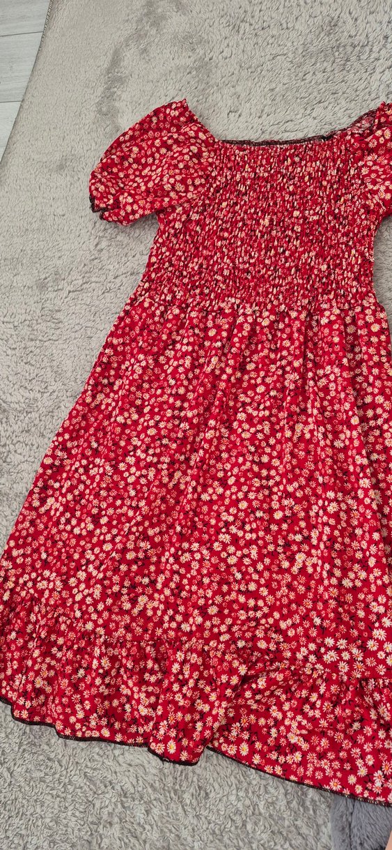 Yumuşak sentetik kumaştan, kısa kollu, tekne yaka, çiçek desenli ve volan detaylı uzun kırmızı bohem tarzda elbise. Rahat ve şık bir görünüm sağlar. m beden tatilde kullanıldı sadece sorunsuz şirin bir elbise