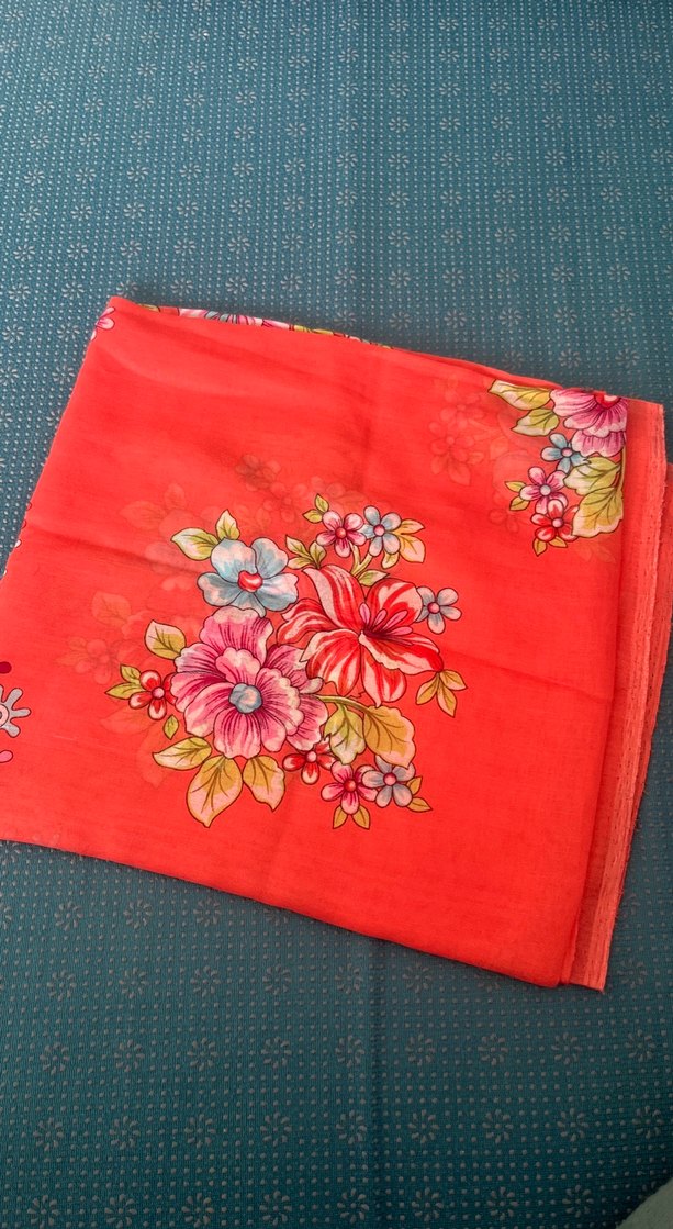 Renkli çiçek desenleri ve drapeli tasarımıyla pembe, yumuşak sentetik kumaştan bohem kadın yazma. Fotoğraf da parlak kırmızı gibi duruyor fakat bebe narçiçeği karışımı ara renktir