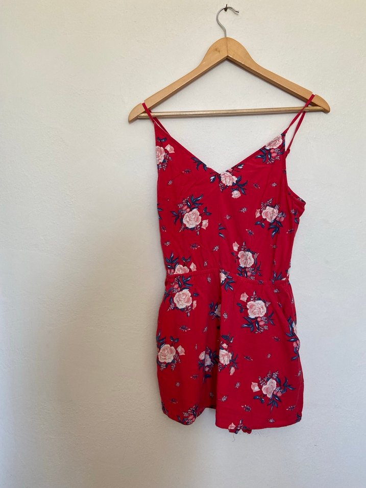 Kırmızı, çiçek desenli bohem tarzda, v yaka ve kolsuz, vücuda oturan kısa tulum. Yumuşak tekstil kumaştan, günlük kullanım için uygundur.
