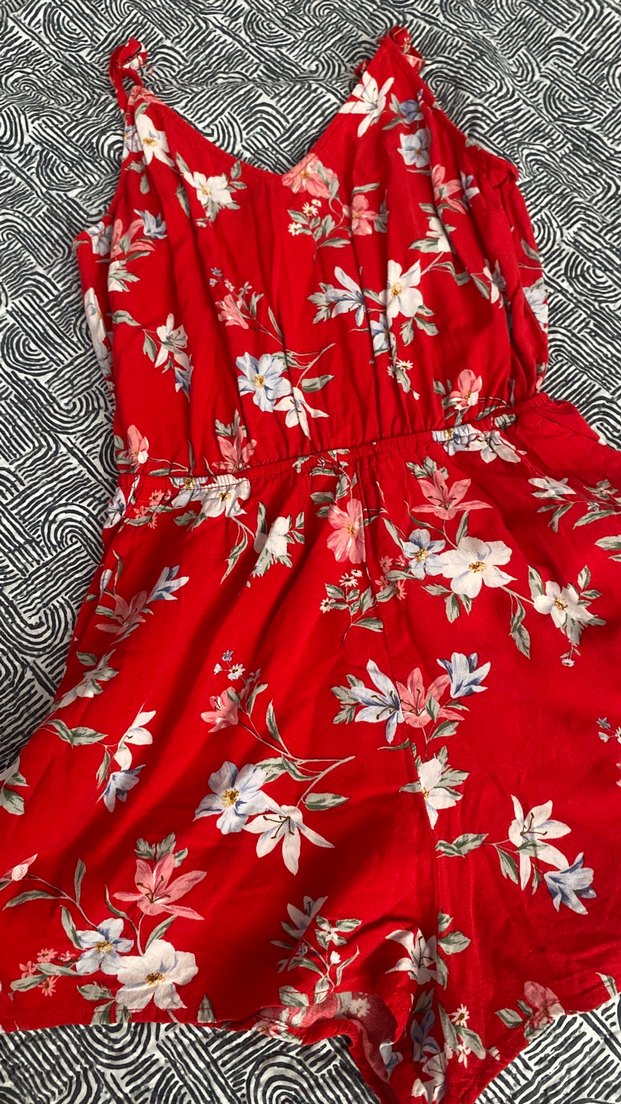 Kırmızı tulum, çiçek desenli ve volan detaylıdır. V yaka ve askılı kolludur, bol kesimiyle rahat bir bohem tarz sunar.