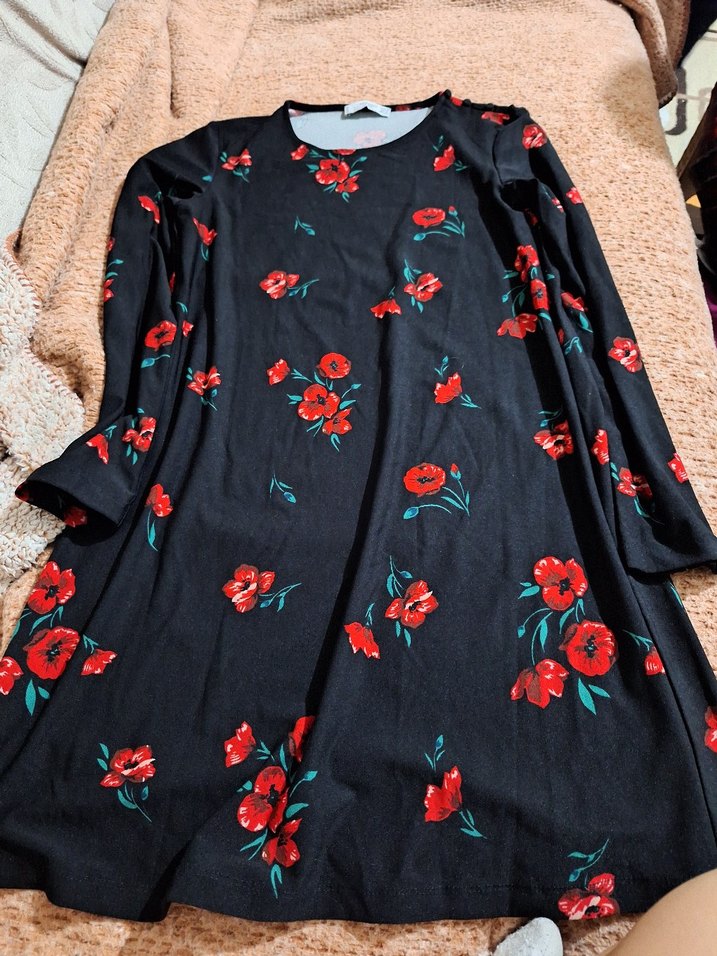 Uzun kollu, yuvarlak yaka, bol kesim midi elbise. Koyu zemin üzerinde canlı kırmızı çiçek desenleri ve dökümlü bohem tarzı bulunur. Yumuşak sentetik kumaştan yapılmıştır.