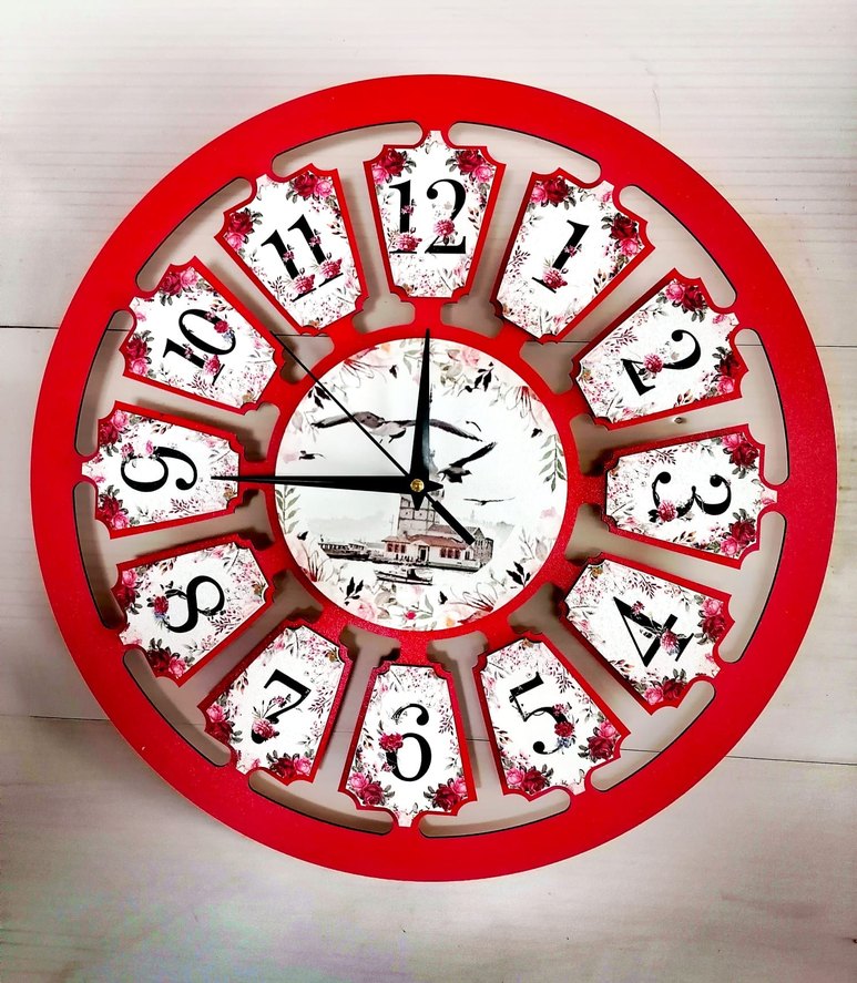 Kırmızı çerçeveli, çiçek desenli renkli rakam panelleri ve ortasında resimli duvar saati. ️