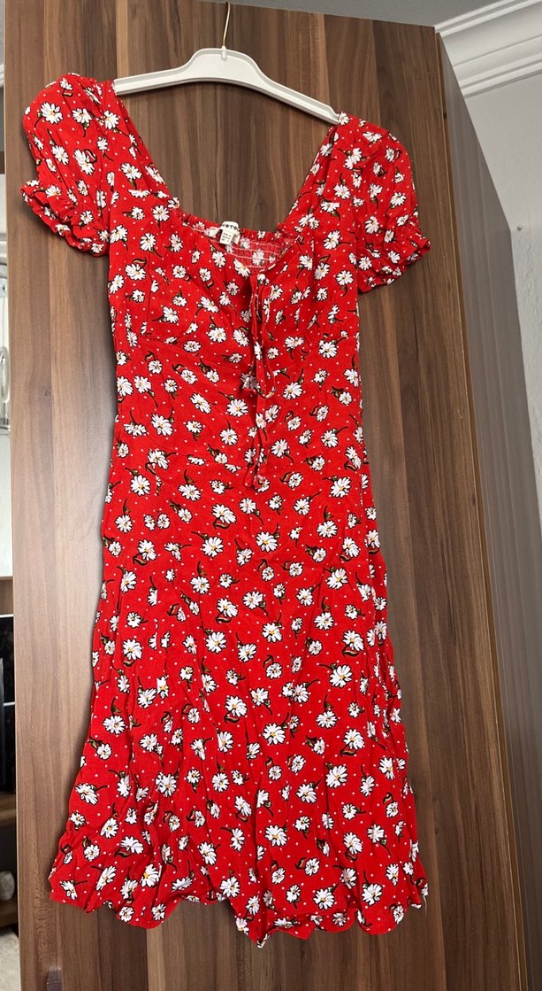 Kırmızı Çiçek Desenli Fırfırlı Kisa Elbise