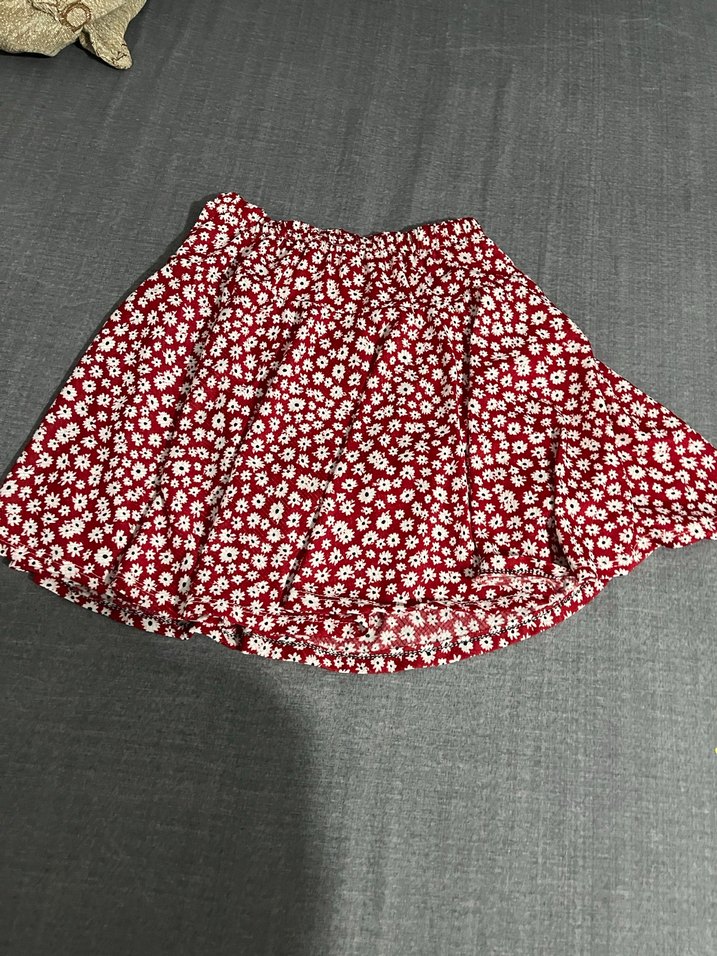 Kırmızı çiçek desenli, pamuklu, bol kesim ve fırfırlı mini etek. Bohem ve sokak stiliyle uyumlu, dış mekan kullanımı için uygun.