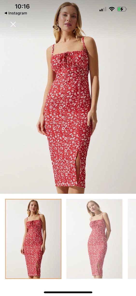 Kırmızı açık tonlu, çiçek desenli ve dantelli, straplez yakalı, uzun ve vücuda oturan elbise. İnce askılı ve bohem tarzda, romantik akşamlar için uygun.