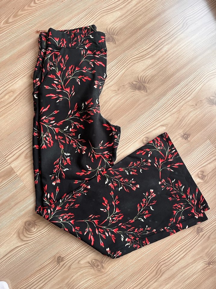 Uzun boy, kırmızı çiçek desenli sentetik kumaştan kadın pantolon. Beden olarak L yazıyor ancak M beden için uygundur.
