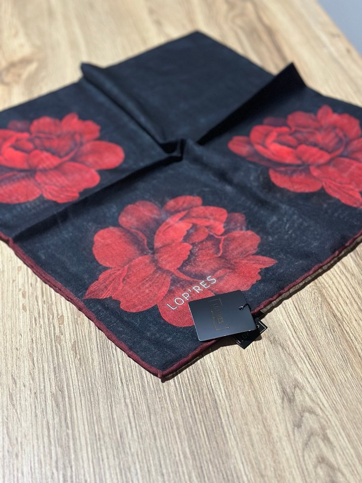 Koyu renkli tekstil fular, büyük kırmızı çiçek desenleri ve fırfırlı kenarlarıyla bohem ve rahat tarzı bir araya getirir.