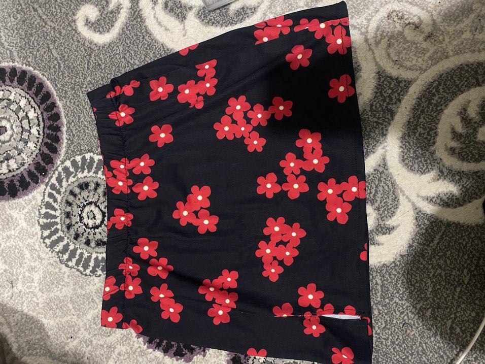 Koyu kırmızı çiçek desenli, fırfırlı ve vücuda oturan bu mini etek, yumuşak sentetik kumaştan üretilmiştir. Midi boyu ve bohem tarzıyla rahat bir görünüm sunar.