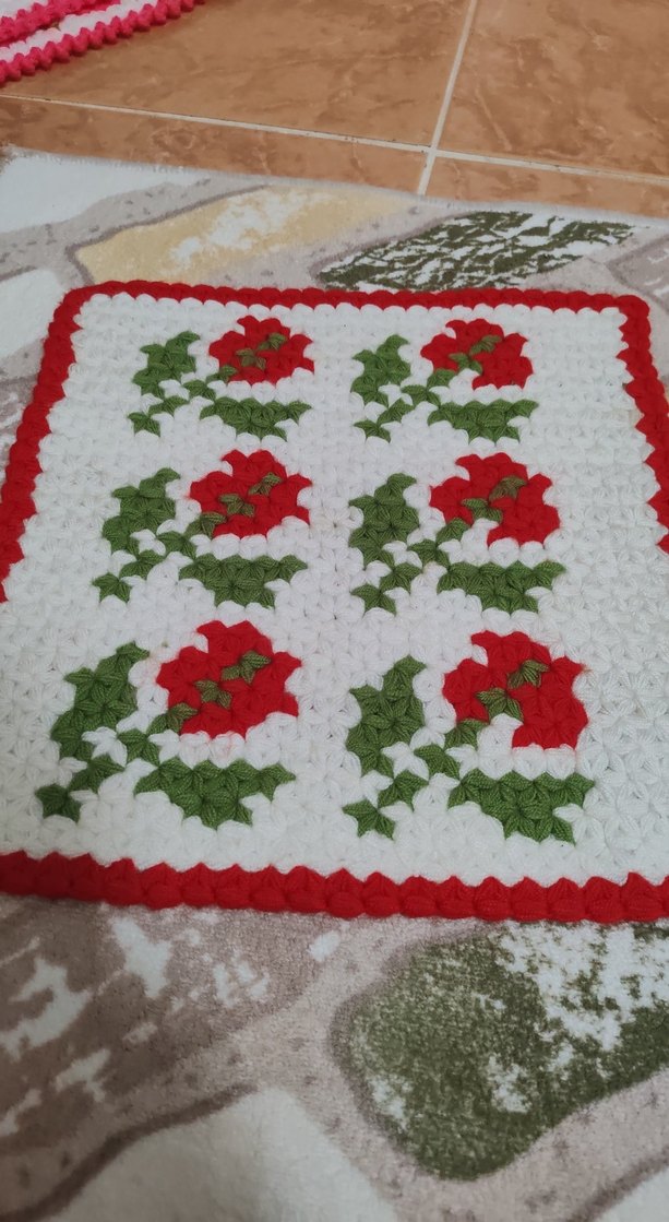 Kırmızı çiçek desenli, yeşil yapraklı ve açık kırmızı kenarlı örgü banyo süngeri. Yumuşak dokulu, nazik kullanım sağlar.