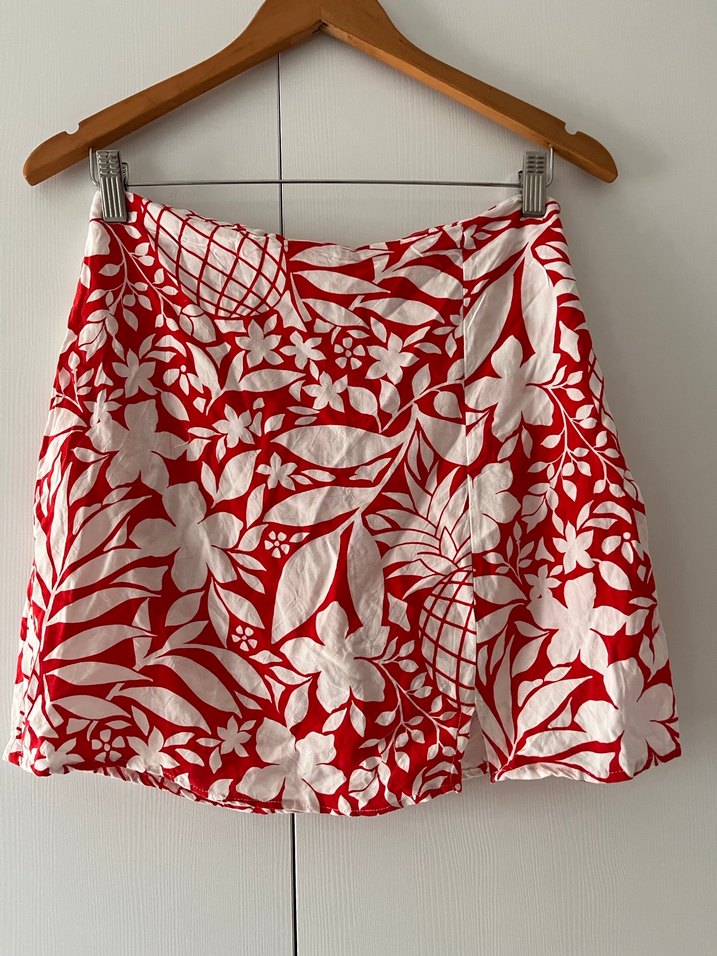 Kırmızı, çiçek desenli ve pileli kısa etek. Bol kesim ve tekstil kumaştan, bohem tarzını yansıtır.