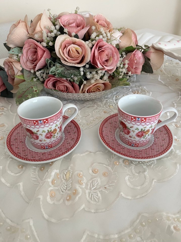 İki adet porselen fincan ve tabağından oluşan, kırmızı çiçek desenli renkli bir set. büyüktür
