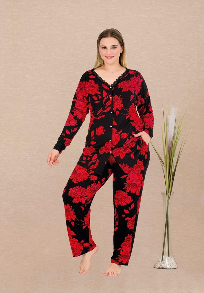 Uzun kollu, bol kesim kadın pijama takımı, koyu kırmızı çiçek desenlidir. Rahat ve sokak stiliyle konfor sağlar.