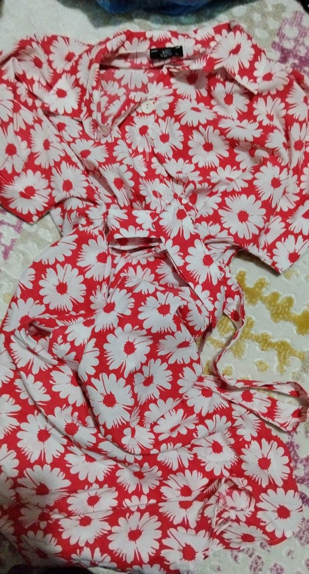 Renkli kırmızı çiçek desenli, strappy kollu, kayık yaka ve dizin altında, dar değil bol kesim bir elbise.