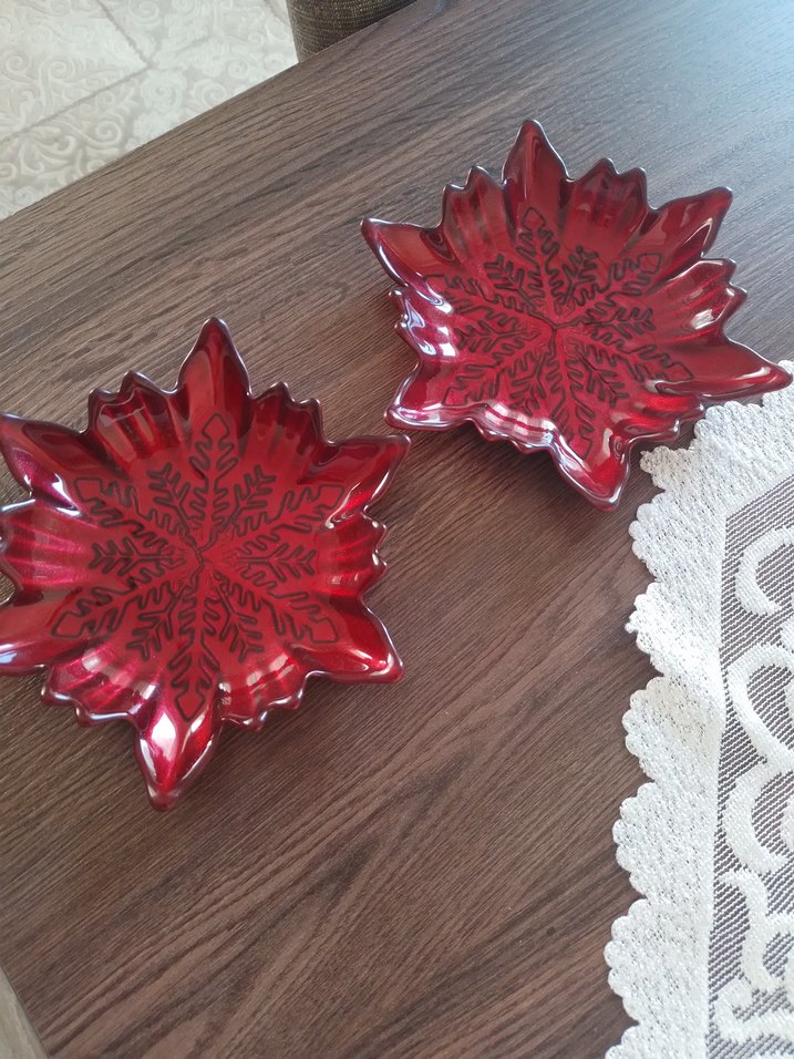 Kırmızı renkte, yaprak şeklinde ve renkli çiçek desenleriyle süslenmiş iki tabak seti. Masanıza şık bir dokunuş katar. ️