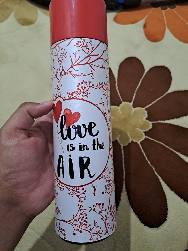 Kırmızı kapaklı, çiçek desenli ve 'love is in the AiR' yazılı renkli termos şişe. İçecekleri sıcak tutar. ❤️