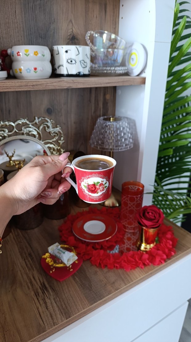 Kırmızı çiçek desenli Türk kahvesi fincanı ve uyumlu tabağı ile geleneksel kahve sunumu için ideal. ☕