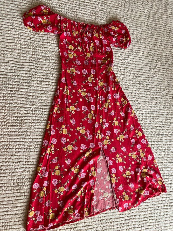 ESKİ SEZON, HİÇBİR PROBLEMİ YOKTUR Kırmızı renkli, çiçek desenli uzun elbise, tekne yaka ve drapeli tasarıma sahiptir. İnce askılı kollu ve vücuda oturan kesimlidir. Günlük kullanıma uygundur.