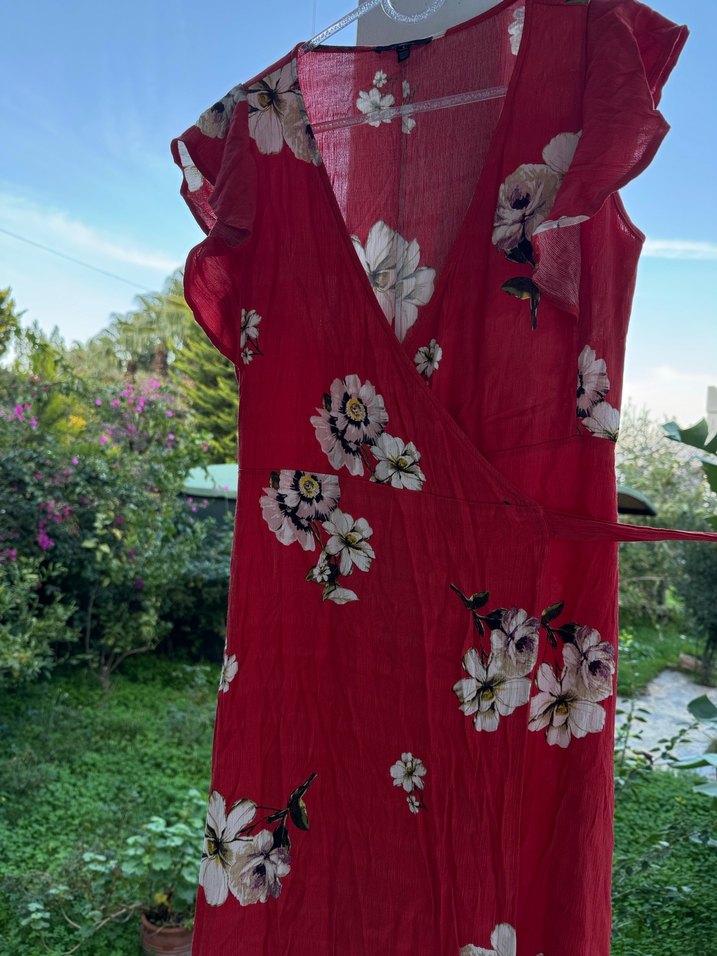 Nar çiçeği kırmızısı renkte, çiçek desenli, kısa kollu ve salaş kesimli uzun bohem elbise.