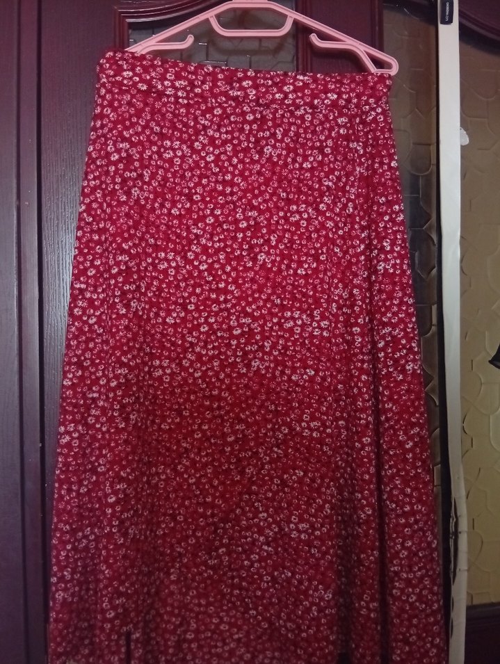 kırmızı renkte, cicek desenli, bol kesim ve drapeli uzun etek. Sentetik kumaştan, bohem tarzını yansıtır. ışıktan dolayı rengi açık durmuş olabilir çok tatlı bir kırmızı renktedir