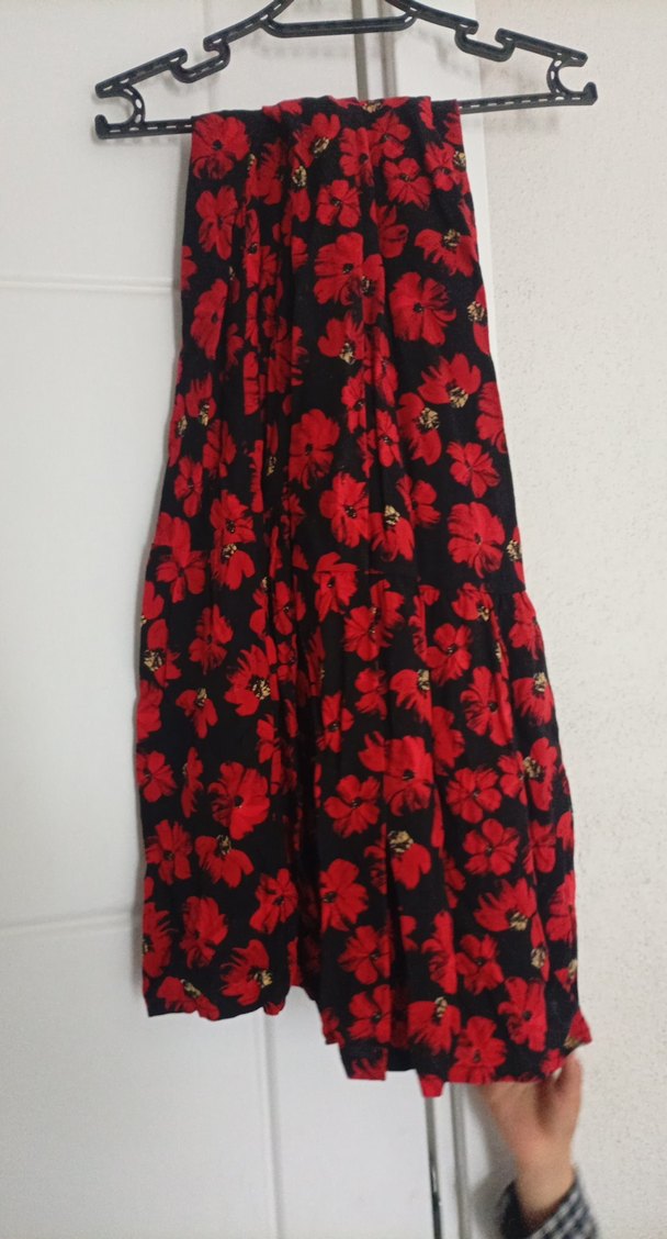 Kırmızı çiçek desenli, dökümlü ve bol kesim uzun etek, yumuşak sentetik kumaştan, bohem tarz için uygun.