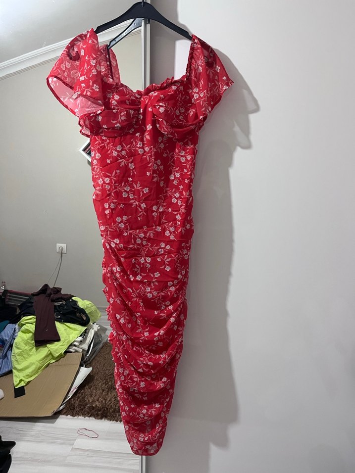 Kırmızı Çiçek Desenli Uzun Drapeli Kadın Elbise