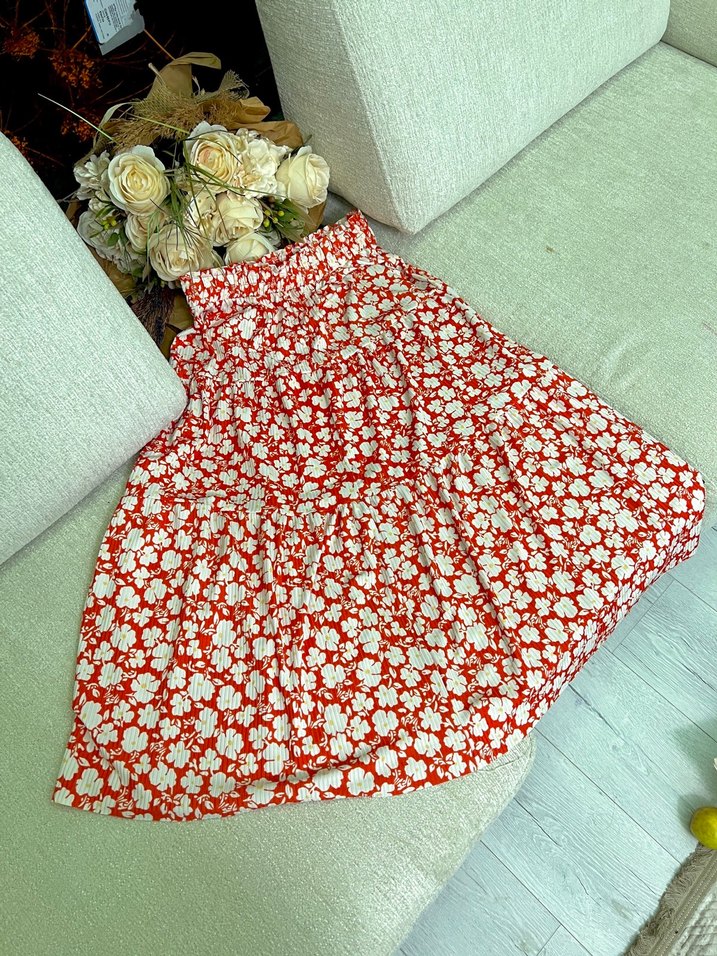 Renkli kırmızı çiçek desenli, bol kesim uzun etek fırfır detaylı, rahat ve bohem tarzda. Üstüne beyaz crop veya penye tshirt giyildiği zaman çok güzel oluyor hiç kullanılmadı sıfır