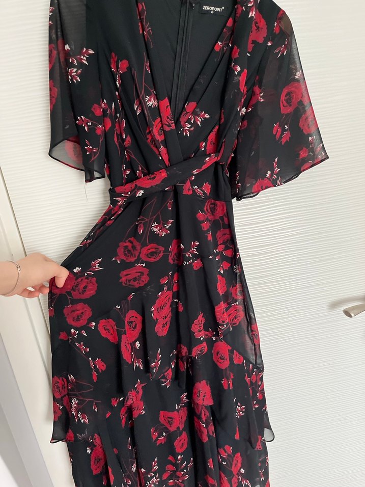 Kırmızı Çiçek Desenli Uzun Kadın Elbise