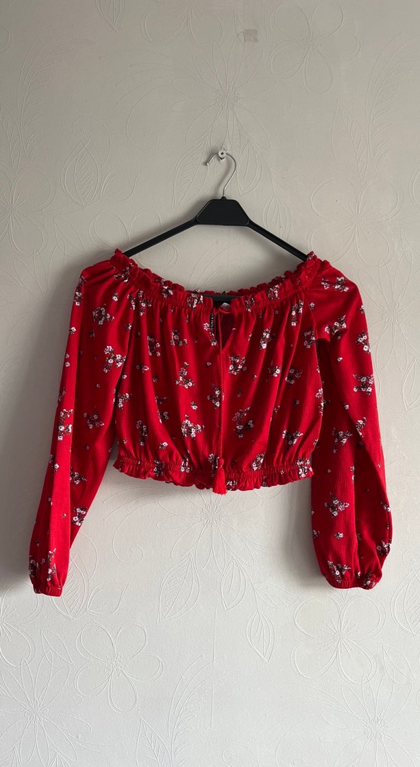 Kırmızı, uzun kollu, tekne yakalı ve bol kesim kısa crop bluz. Yumuşak pamuktan, renkli çiçek desenli ve düğmeli detaylara sahip, günlük sokak stili için uygun.
