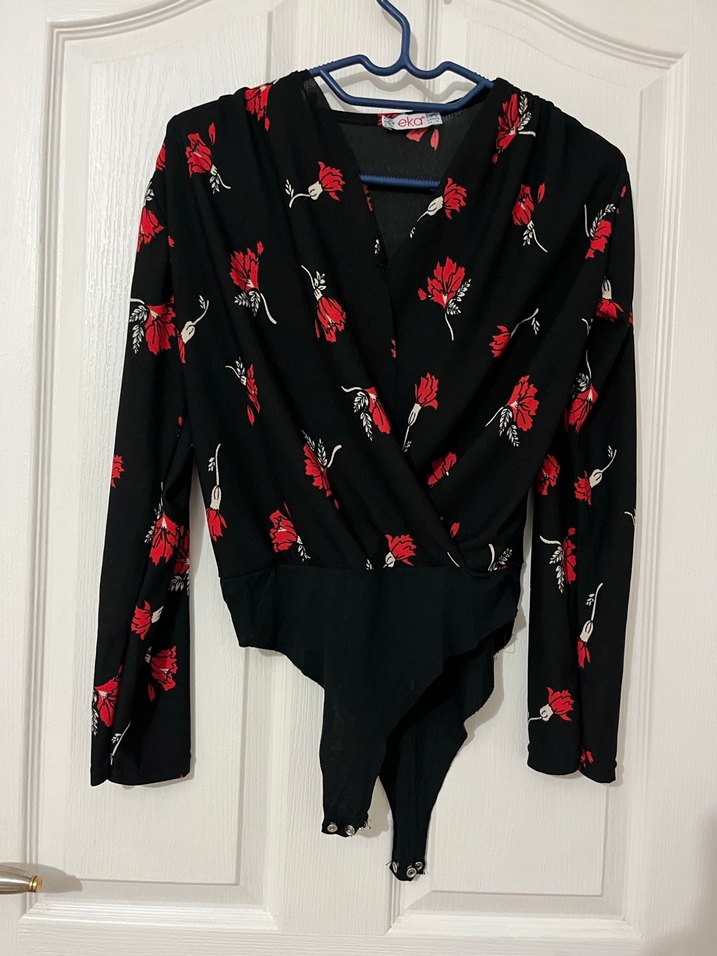 Uzun kollu, drapeli V yaka, kırmızı çiçek desenli ve sentetik kumaştan yapılmış, midi boyda dar kesim bluz. Şık ve rahat günlük kullanım için uygun.