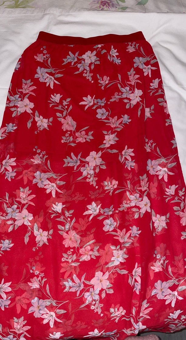 Uzun kırmızı etek, çiçek desenli tasarıma sahiptir. Sentetik kumaştan, bol kesim ve bohem stilde üretilmiştir.