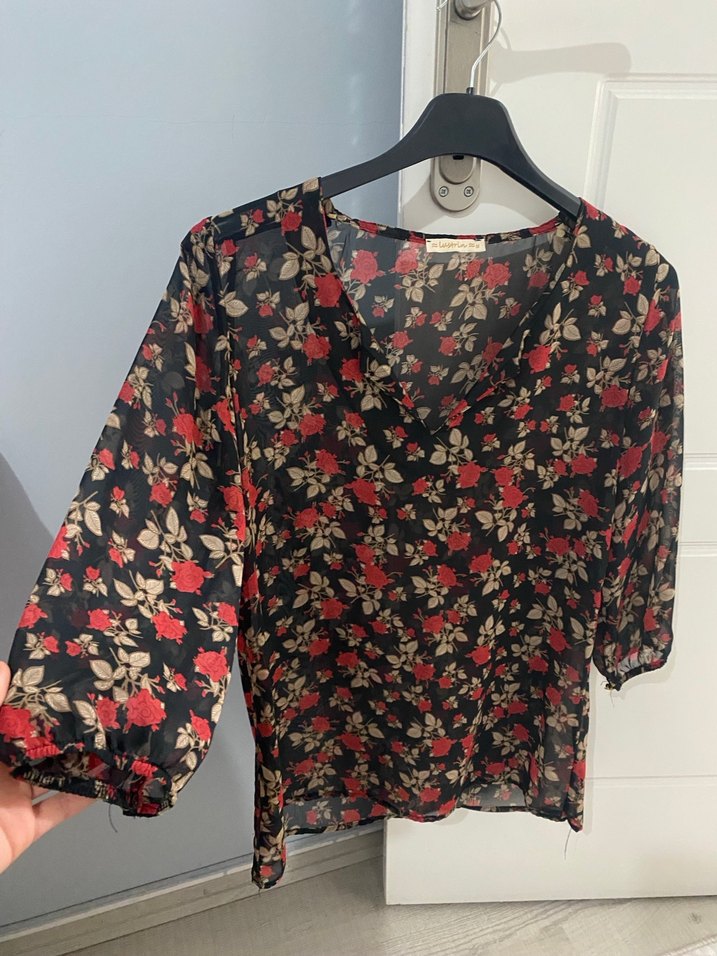 Kırmızı Çiçek Desenli V Yaka Kadın Bluz