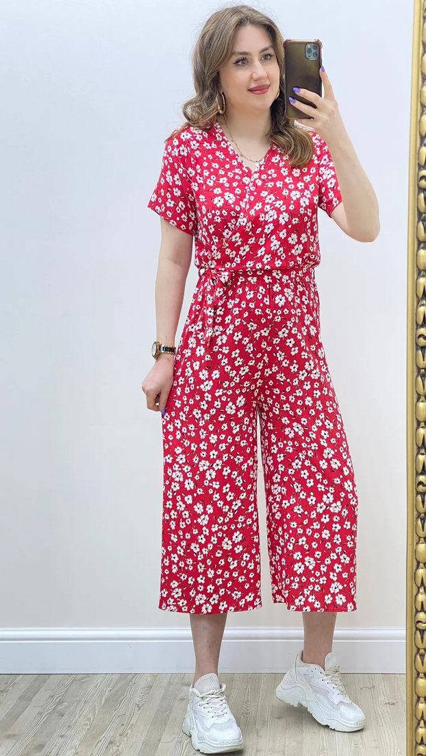 Kırmızı Çiçek Desenli V Yaka Tulum
