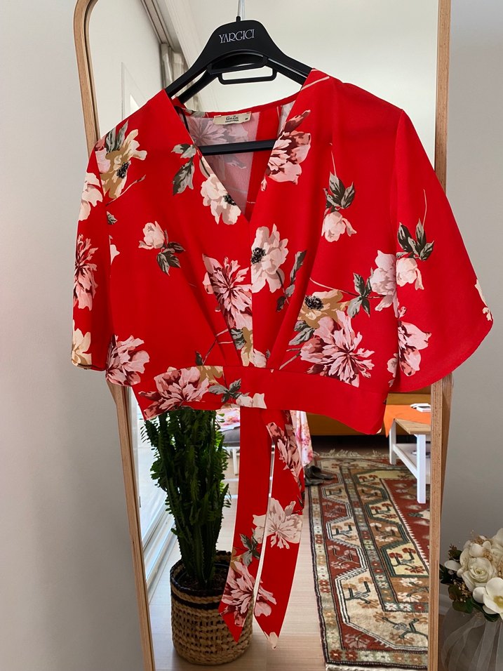 Kırmızı renkli, V yakalı ve kısa kollu bluz, gevşek ve drapeli kesime sahiptir. Çiçek desenli ve mini boyda, günlük kullanıma uygundur.