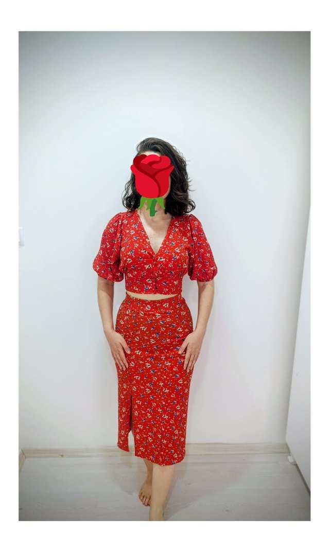 Kırmızı Çiçek Desenli V Yakalı Midi Elbise