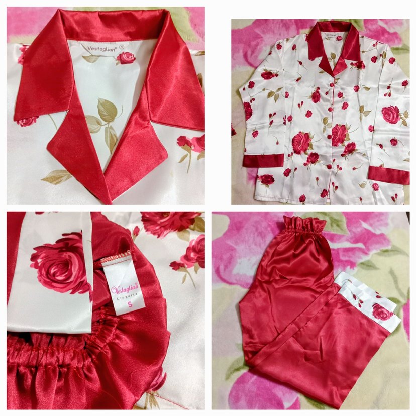 Renkli çiçek desenli, vintage tarzda kadın pijama takımı. kırmızı ve beyaz tonlarda, bol kesim Rahat ve yumuşak kumaşlıdır.