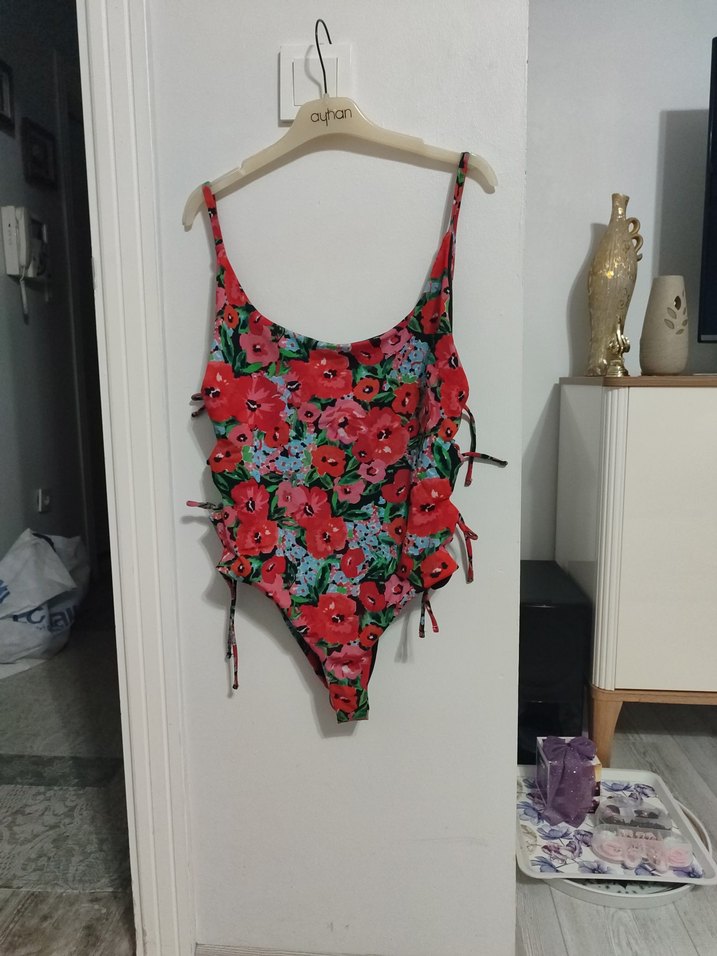 Renkli kırmızı çiçek desenli, ince askılı ve volan detaylı, kısa kesim kadın mayo, plaj için uygun.