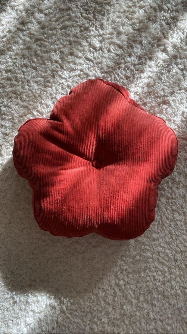 Yumuşak dokulu, çiçek şeklinde kırmızı renkli yastık, renkli ve dikkat çekici bir görünüm sağlar.