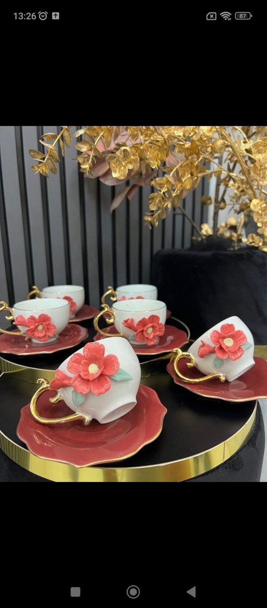 Kırmızı tabaklı, beyaz fincanlarda kırmızı çiçek detayları ve altın kulplar bulunan şık kahve fincan takımı. ☕