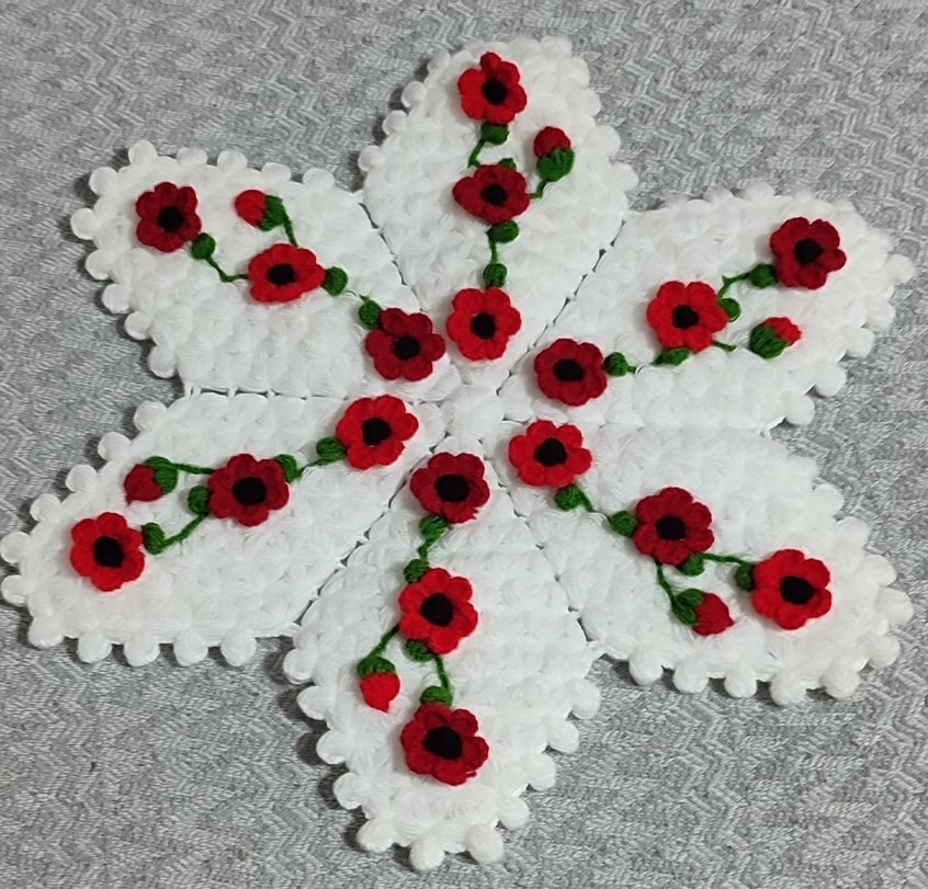Kırmızı çiçek işlemeli beyaz el işi örtü, narin dokulu kenarlarla süslenmiştir. Geleneksel el sanatlarından bir parçadır.