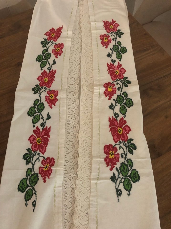 Beyaz pamuklu kumaş zemin üzerinde kırmızı çiçekleri ve mükemmel işçiliği ile hiç yıkanmamamış dikilmemiş bile daha iki başı işlenmiş yastık.Danteli de mükemmel.İster çeyizlik ister hemen kullanıma hazır.Her türkü tasarım içinde mükemmel ağır motifli bir yastık.