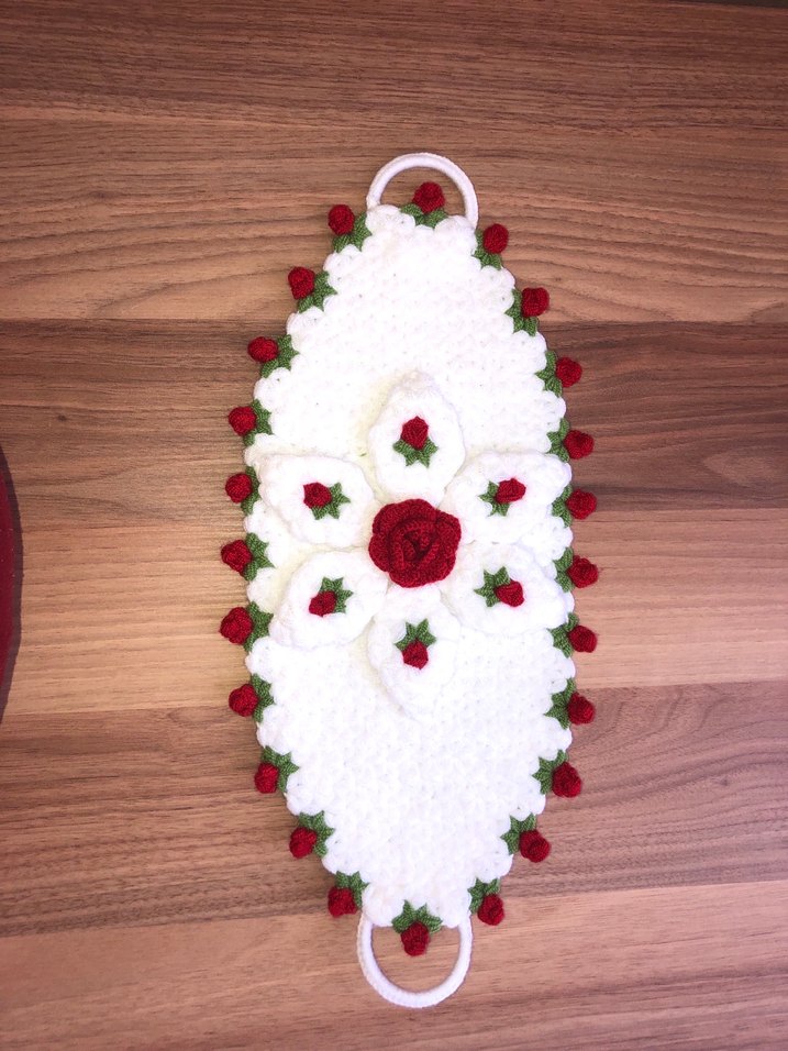 Kırmızı çiçek detaylı beyaz el örgüsü duvar süsü, asmak için halkalarla birlikte. Geleneksel tığ işi tekniğiyle yapılmıştır.