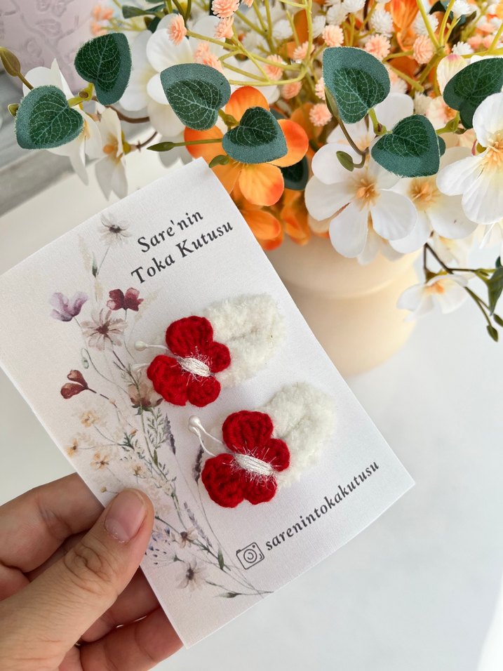 Çocuklar için kırmızı çiçek desenli, bohem tarzda saç tokası seti. Yumuşak malzemeden üretilmiş, Velcro kapamalı tokalar.