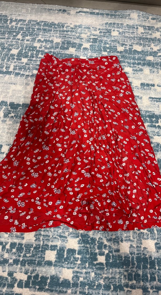 Kırmızı tonlarında, beyaz küçük çiçek desenli, bol kesim ve drapeli uzun midi etek. Bohem tarzı için uygun, dış mekan kullanımı için ideal.